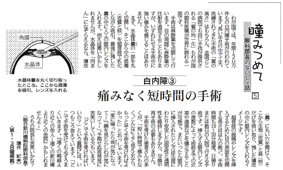 瞳みつめて 第5回「白内障③~痛みなく短時間の手術」