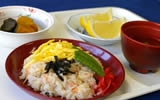 | 寒い日にも身体が温まる 湯豆腐の献立です。ベッタラ漬も手作りです。 | タラバカニが入ったちらし寿司です。やさしい味に仕上げました。 | トンカツは、人気メニューのひとつです。当院では金平ごぼうにセロリやシメジを使います。 |